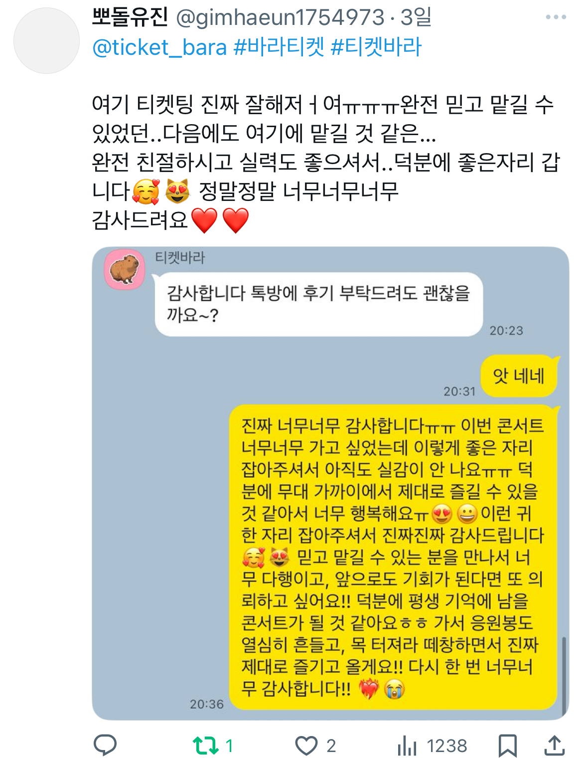 앞으로 트위터후기는 월마다 이 카테고리에서 확인가능합니다 🤎1월 31일까지 쭉 업데이트 될 예정입니다문의🦫http://pf.kakao.com/_xbxlxcFG 틧터🎫https://x.com/ticket_bara?s=21&t=kO9a9FCsBHrhXHpp6zuEGg