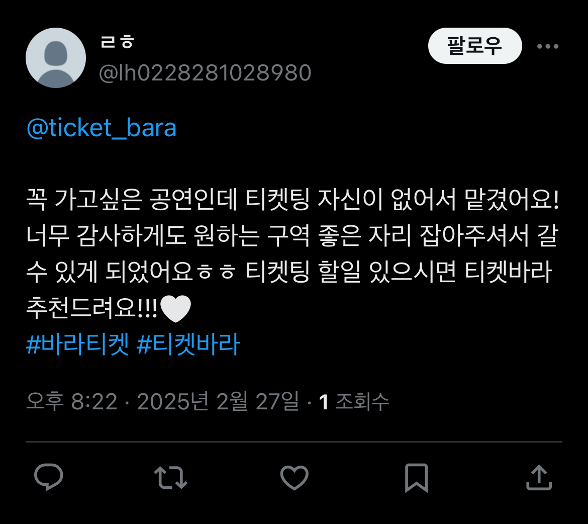 앞으로 트위터후기는 월마다 이 카테고리에서 확인가능합니다 🤎2월 28일까지 쭉 업데이트 될 예정입니다문의🦫http://pf.kakao.com/_xbxlxcFG 틧터🎫https://x.com/ticket_bara?s=21&t=kO9a9FCsBHrhXHpp6zuEGg